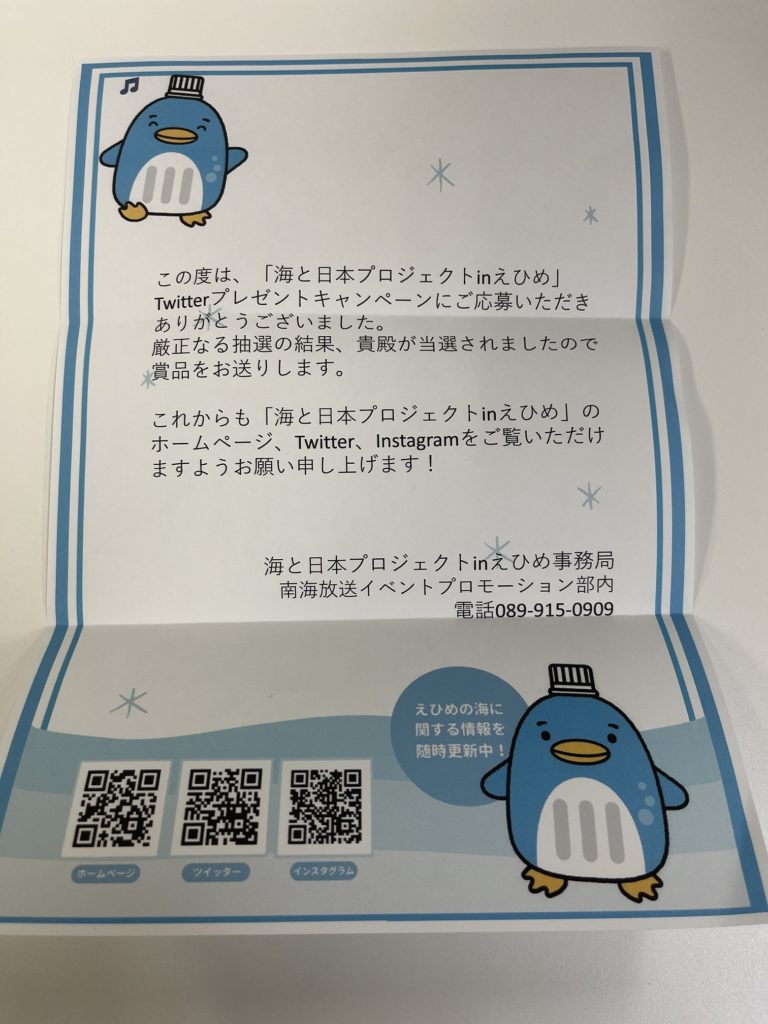 さて、ぶりんがーは、このように愛媛愛好家なのですが、日ごろの行いが良かったため海と日本プロジェクトinえひめさんの懸賞に当たりました!YATTANE